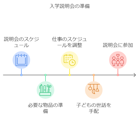 また、説明会ではスリッパや筆記用具、現金が必要となる場合がありますので、事前に何を持っていくべきか確認しておきましょう。説明会の参加には、平日であることが多いため、仕事との調整が必要になることがあります。特に、未就園児がいる家庭では、子どもをどこに預けるかも考慮しなければなりません。子どもを連れて行く場合は、説明が聞き漏れないように、事前に資料を確認しておくことをおすすめします。