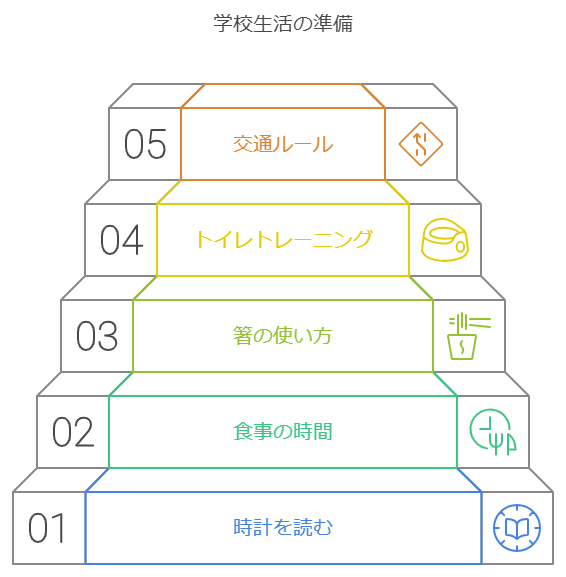 小学校生活に向けて、子どもの生活習慣を整えることも非常に重要です。まず、時計を読む習慣をつけることが必要です。学校に通うためには、時間を守ることが求められますので、時計を読んで、登校時間を意識できるようにする練習を始めると良いでしょう。また、給食の時間に合わせて食事を終える練習や、箸を使った食事の練習も重要です。これらの習慣を身に付けておくことで、学校生活のスタートがスムーズになります。