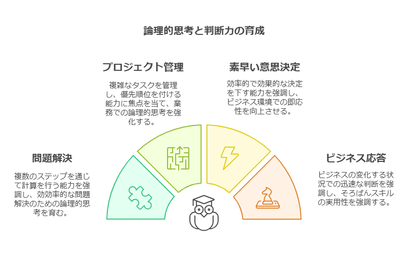 そろばんを使って計算を行う過程で、どの計算を先に行うべきか、どの方法が効率的かを考える能力が身につきます。このような判断力は、仕事においても非常に重要です。例えば、迅速に決断を下さなければならない場面で、そろばんの訓練で培った判断力を活用することで、素早く適切な意思決定を行うことができます。