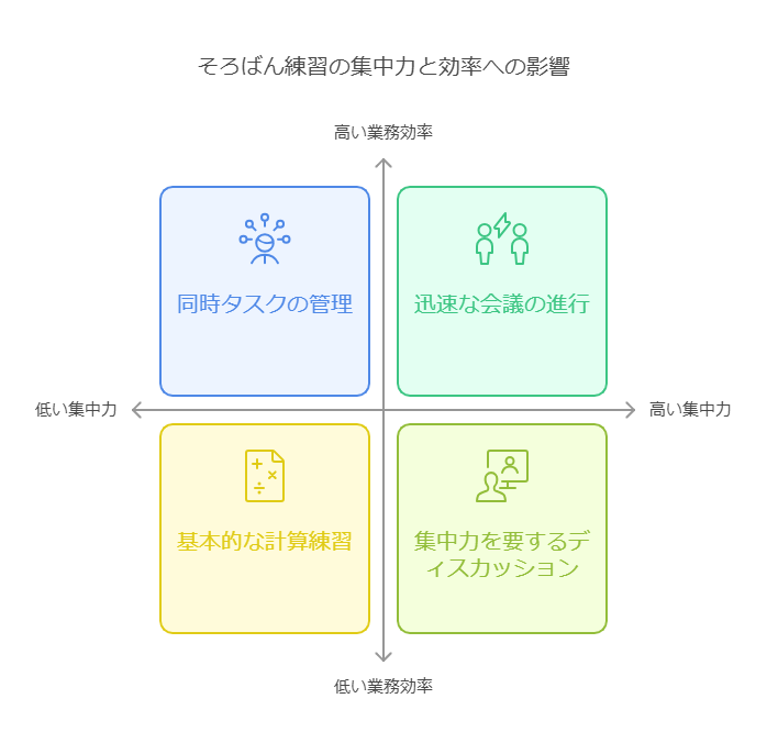 また、複数の業務を同時に進行する際には、高い集中力が欠かせません。そろばんの練習により、ひとつひとつの作業に深く集中する力が養われ、その結果、業務全体のパフォーマンスが向上します。