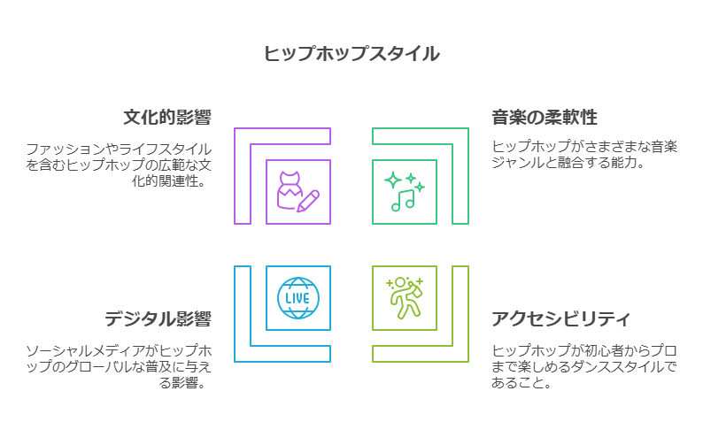 スタイルHIPHOPは、単なるダンススタイルではなく、文化的な要素としても注目されています。ファッションや音楽、ライフスタイルと密接に結びついており、若者文化に大きな影響を与えています。