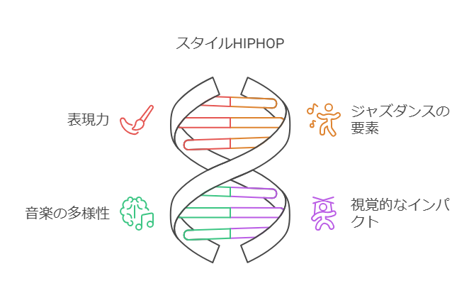 スタイルHIPHOPは、ヒップホップ特有のリズム感とジャズダンスのしなやかさを融合させたスタイルです。このため、滑らかな動きと緩急をつけた表現が特徴的です。ジャズダンスのテクニックを取り入れることで、スタイルHIPHOPは洗練された印象を与えることができます。