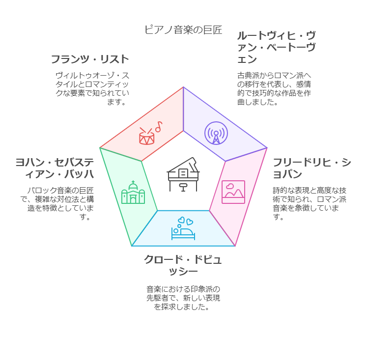 これらの作曲家とその代表曲は、ピアノ音楽の魅力を最大限に引き出すものであり、初心者から上級者まで多くの人々に愛されています。技術的な挑戦を提供するだけでなく、深い感情を表現する機会を与えてくれます。