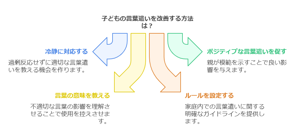 1. 冷静に対応する 子どもが悪い言葉を使った際に過剰に反応するのは逆効果です。感情的にならず、冷静に「その言葉は適切ではない」と伝えることで、子どもに正しい言葉遣いを教える機会を作ります。