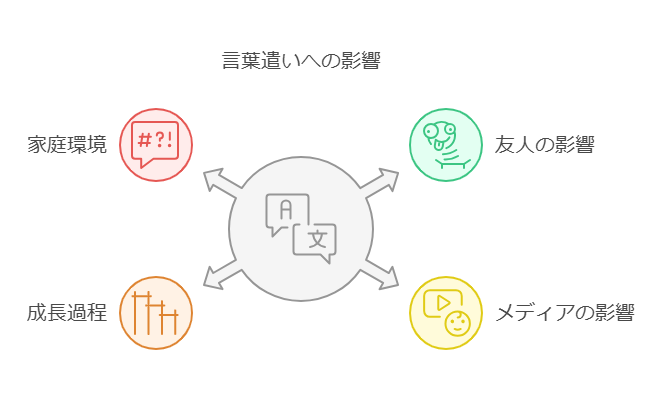 4. 家庭環境の影響 家庭での会話の中で無意識に使われる言葉や表現も、子どもの言葉遣いに影響を与えます。特に家庭内で乱暴な言葉遣いが日常的に行われている場合、子どもがそれを模倣する可能性が高くなります。