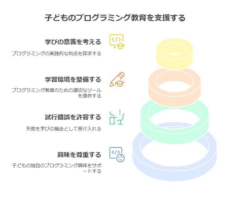 プログラミングでは、バグやエラーが出るのは当たり前です。試行錯誤の中からこそ本当の学びが得られるため、失敗したときも責めずに「どうしたら直るかな?」と一緒に考えてあげる姿勢が大切です。失敗を恐れずに挑戦できる環境を整えることで、子どもの探究心を伸ばします。 - 教材や学習環境の整備