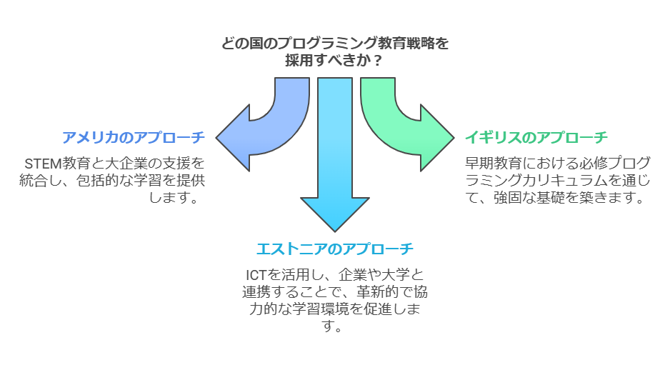 - アメリカ: 「STEM教育」の一環として、理科・数学などの科目と合わせて早期からプログラミングに触れるカリキュラムを整備している州が多く存在します。マイクロソフトやグーグルなどの大企業が支援する教育プログラムも豊富です。