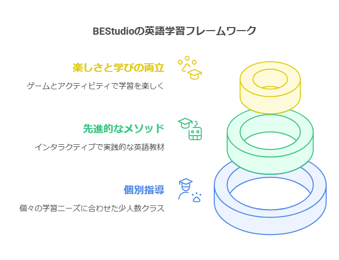 BEStudioの最大の魅力は、最新の教育メソッドと教材を取り入れている点です。例えば、英語の発音やリスニングを強化するためのオーディオ教材や、ゲーム感覚で学べるインタラクティブな教材を使用することで、子供たちは遊び感覚で学べるだけでなく、実践的な英語力を養うことができます。特に、「聞く」「話す」「読む」「書く」の4技能をバランスよく育むカリキュラムは、総合的な英語力を高めることができます。
