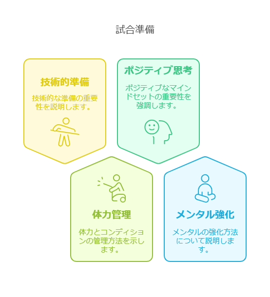 試合当日に最高のパフォーマンスを発揮するためには、体力とコンディションの管理が欠かせません。十分なウォームアップとストレッチングを行い、身体を準備することが大切です。また、試合前日はしっかりと休息を取り、栄養バランスの良い食事を心がけましょう。