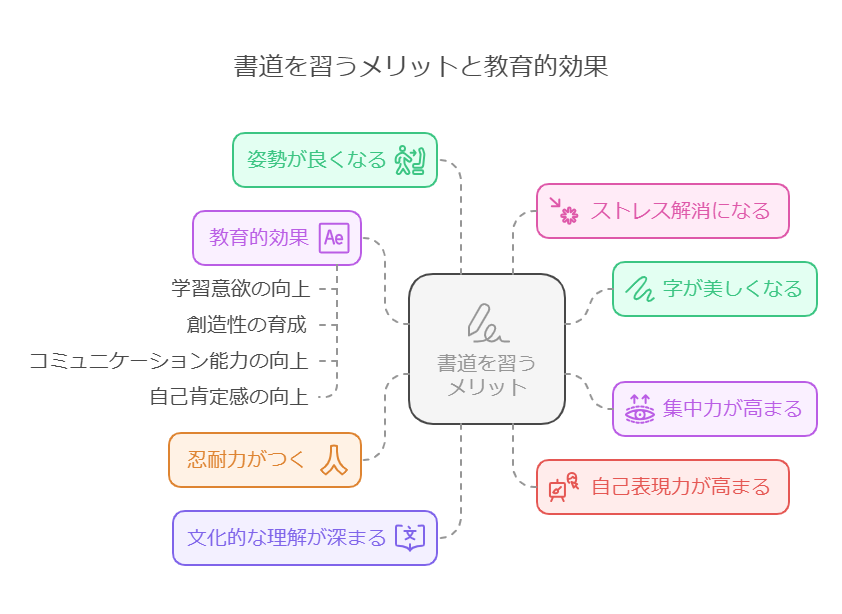 書道を習うことで得られるメリットは多岐にわたります。以下にその主なものを挙げます。
