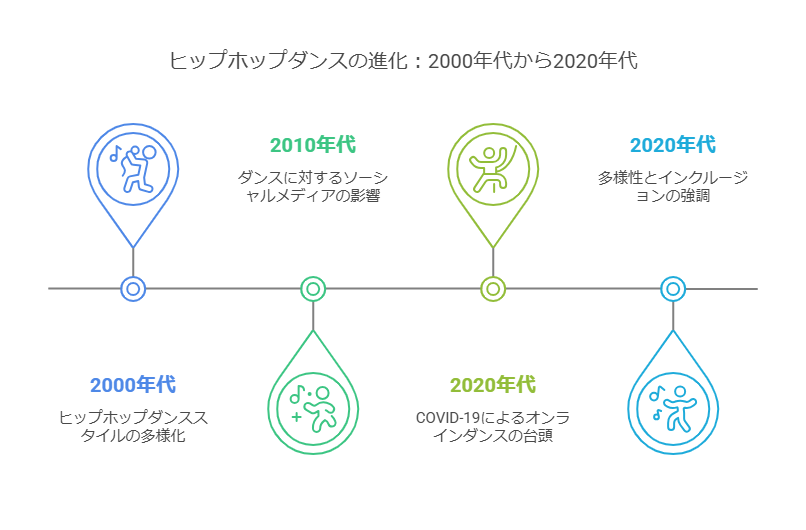 2010年代には、ソーシャルメディアの普及により、ヒップホップダンスがさらに広く共有されるようになりました。YouTubeやInstagramなどのプラットフォームを通じて、ダンサーたちが自分のパフォーマンスを世界中に発信できるようになり、シーンの活性化が進みました。