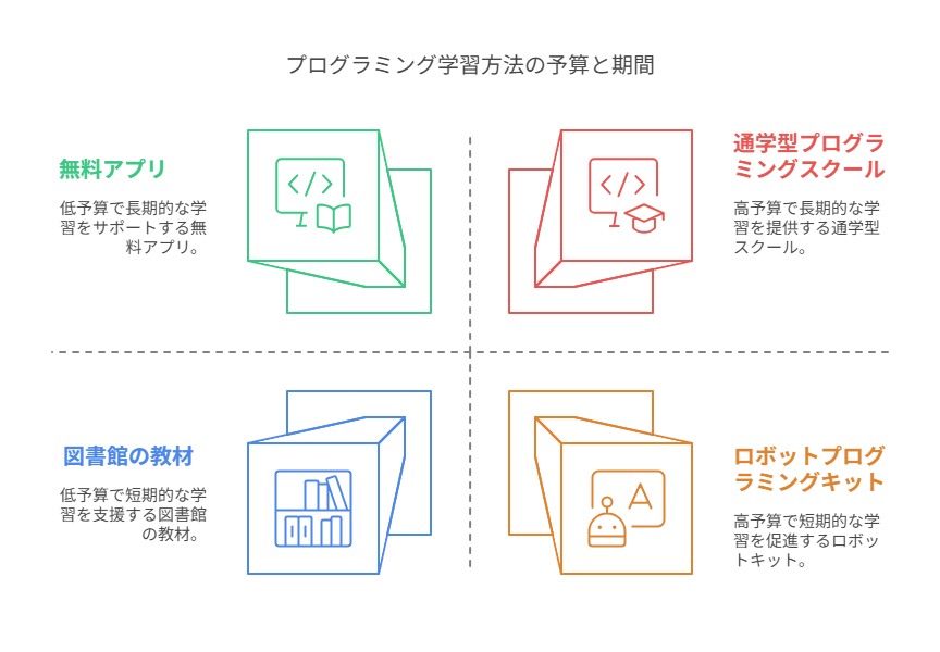 プログラミング学習には様々な方法があり、予算に応じて選択できます。